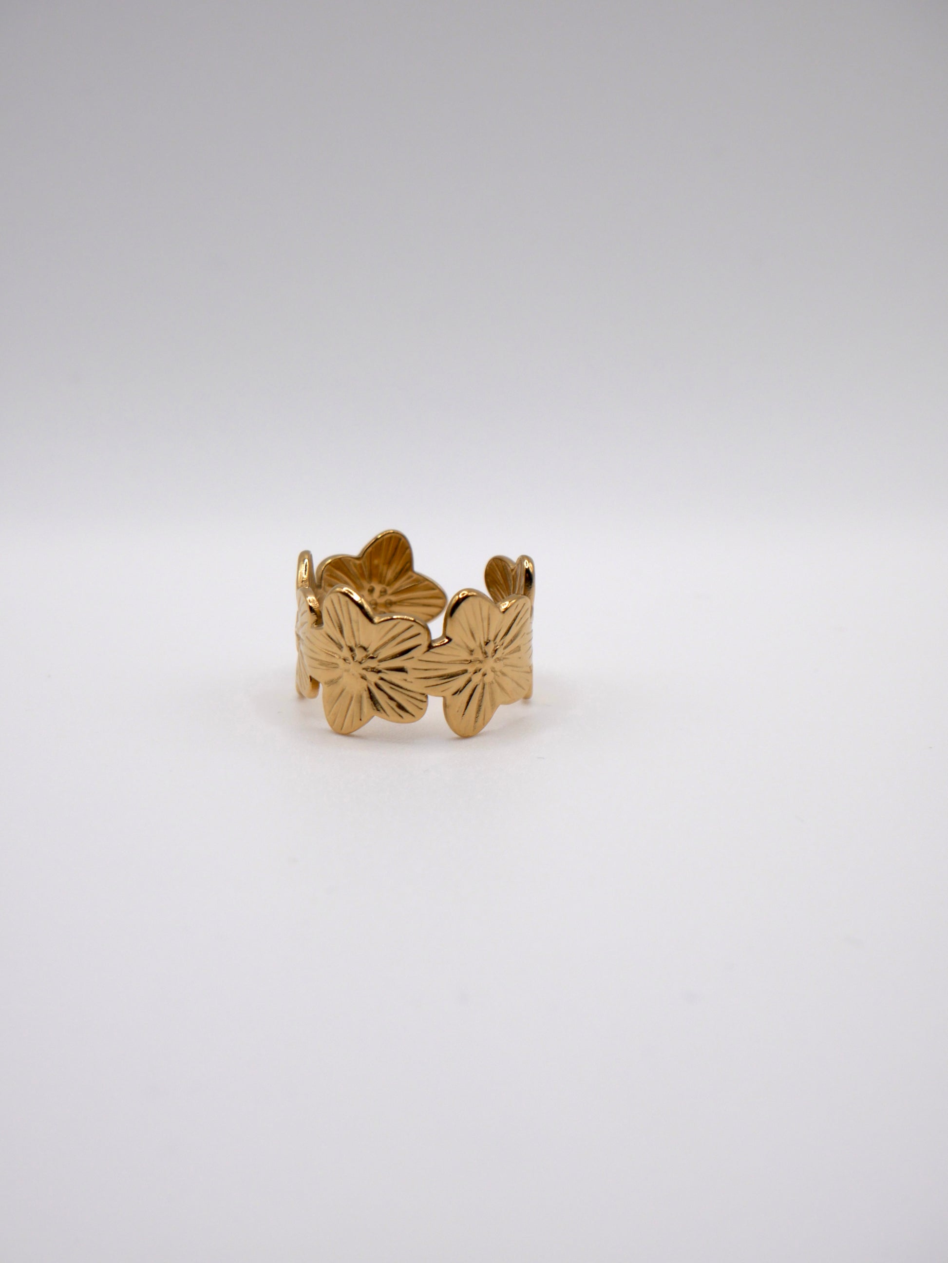 Discover the adjustable golden Flora ring in stainless steel